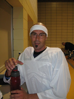 Mon co-quadragénaire de pote Raymondo avant de débuter une partie. Observez son regard candide éclairé par la bonté de son âme malgré son crâne chauve! N'avez vous pas, comme moi, envie de l'adopter? Hélas! Derrière lui, juste au-dessus de son épaule gauche, nous pouvons aussi apercevoir le terrible Rochon (son tortionnaire dominical) choisissant dans son vaste arsenal de bâtons de hockey celui qui pourra le mieux plomber les os de Raymondo.