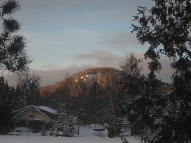 Petite montagne en face de mon chalet. Levé du soleil. Matin de janvier. Vous voyez le chalet en avant plan? La rumeur du lac (c’est à dire les potins des résidents de chalets tout autour) dit qu’il appartient à deux anciennes nones défroquées et devenues gouines. Avant ou après la défroque qu’elles sont devenues gouines? L’histoire ne le dit pas. La rumeur n’a que faire des détails. Ce qu’elle colporte par les cloportes, c’est le sensationnalisme. Anyway, dans ces mêmes rumeurs, moi je suis le pouilleux du lac. Le gars de la ville. Le «Montréalââ». Le gars qui ne tond pas son gazon. Ils peuvent dire n’importe quoi, je m’en fous; c’est quand même moi qui ai pêché le plus gros poisson du lac. Lalalalèèèreuuh!