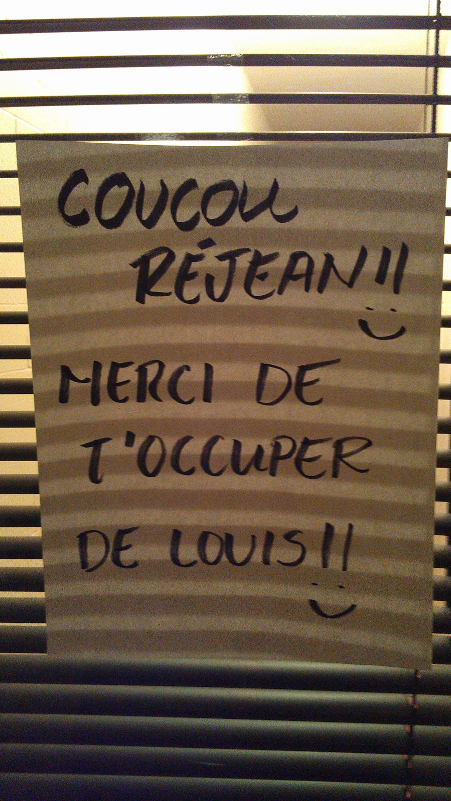 En rentrant, la première chose que j’ai vue c’est ce mot collé dans la fenêtre de la deuxième porte du portique. Je ne pouvais pas le manquer. Petit détail de rien du tout vous direz, mais qui dénote la personnalité attendrissante de mon amie.